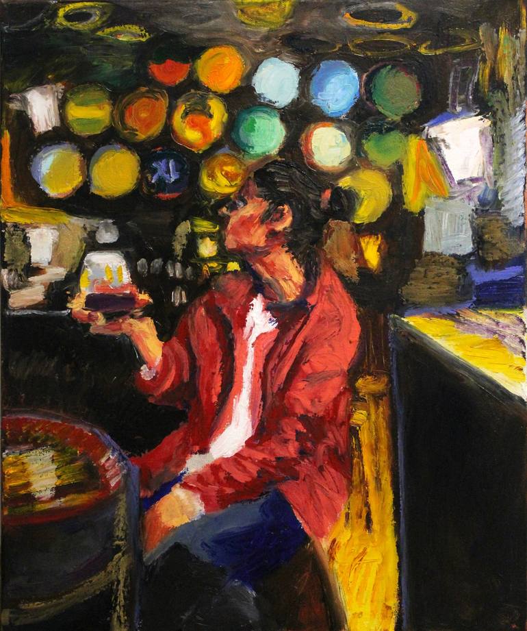 A pigment stick painting of a friend in a famous bar in Brussels. Work is on lightweight canvas and ready to hang.