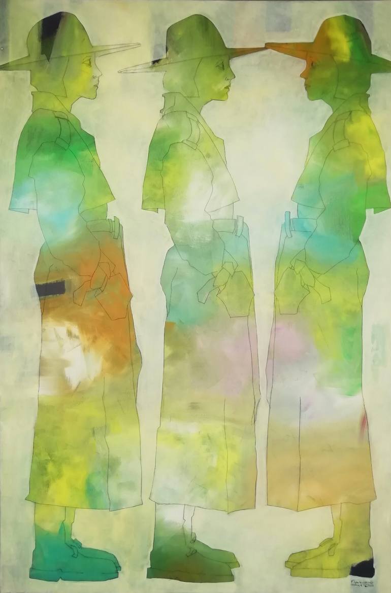 Three translucent, overlapping figures are depicted with elongated noses that connect to one another in a sequential manner. Their stance is upright and formal, with hands clasped in front of them, and they are rendered in a variety of colors that give a dreamlike, ethereal quality to the compositio...