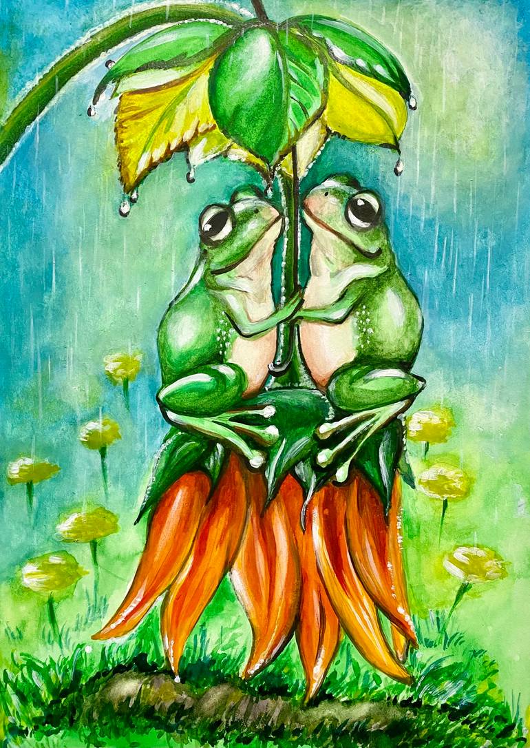 The picture is painted on paper with watercolor paints. Frogs in love are depicted, which are scratching each other.