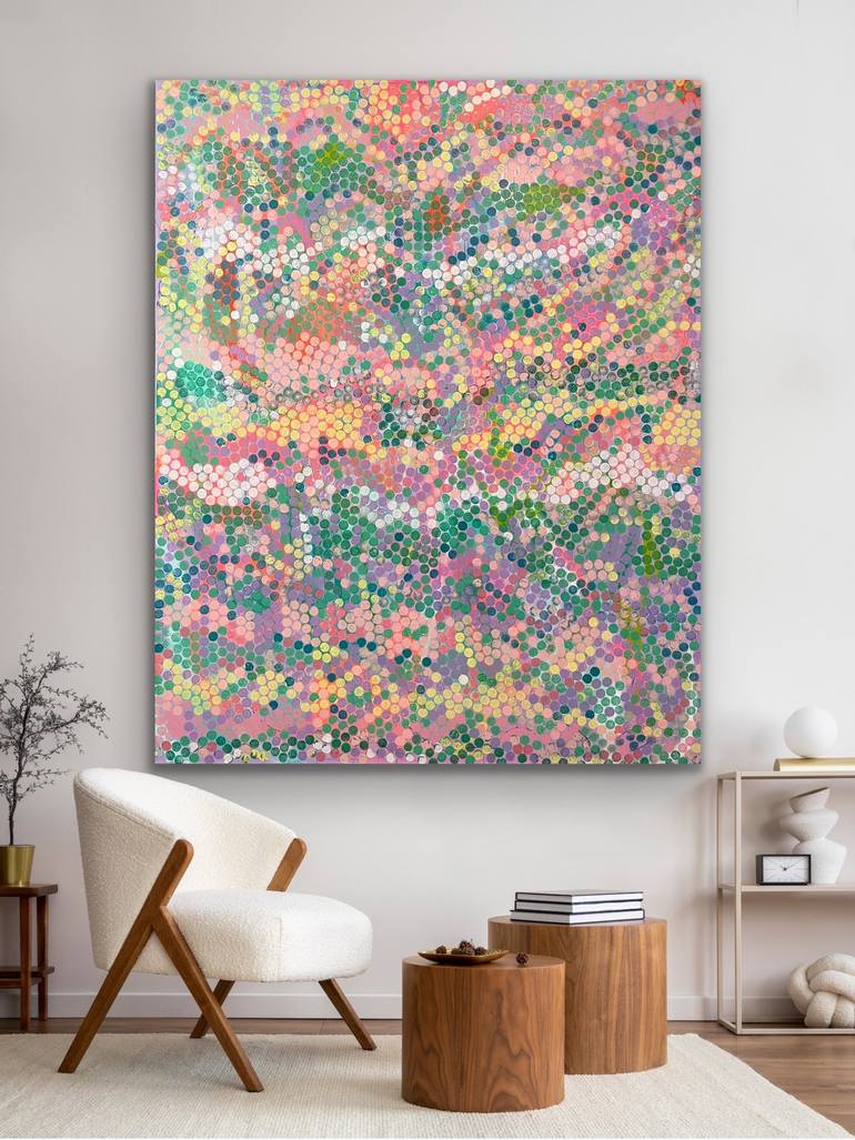 "From Amsterdam" was painted too and named after a song by Mau P. There is so much color, depth and dimension in this piece. Colors are various shades of yellow, greens, purple, blues, teal, pinks, white, peach and neons. Sides are painted a solid color, finished with a final varnish, wired and r...