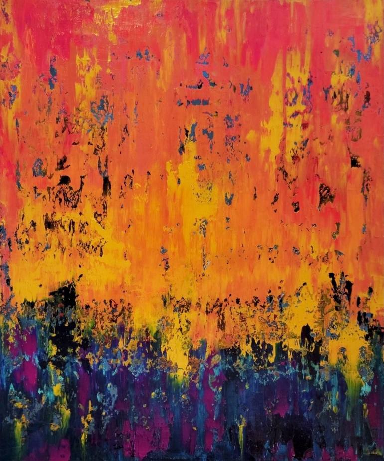 This abstract painting is called, From The Ashes. It is about hope and overcoming hardships. If you look really hard you may see forms emerging from the lower blues, purples, and green colors. From The Ashes, is a nicely textured oil on canvas painting. I did not build the textures up with modellin...