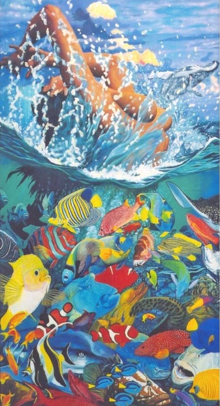 This painting is an allegory of the islands of the north pacific. I worked in Micronesia for four months visiting all of the the principal islands of this far flung nation. Most of them where remnants of volcanoes that rose from the ocean floor. Each was surrounded by living coral reefs and crystal ...