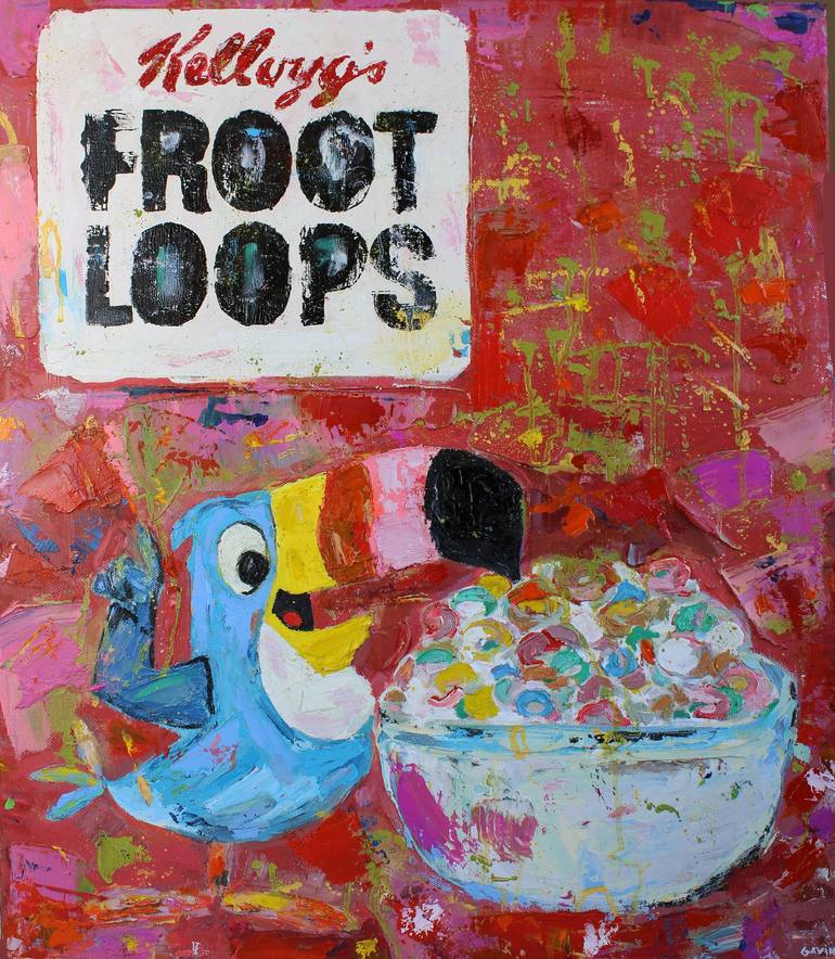 Froot Loops, all the colours of the rainbow are in this pop art painting of vintage Froot Loops cereal carton. Thick sculpted charvin oils on a box canvas, ready to hang, ideal for a kitchen or sitting room
