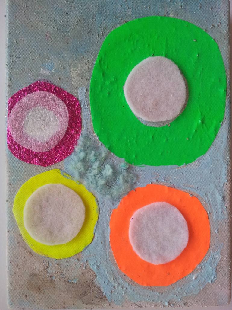 Mixed media canvas. From my new series "A Bowl of soup and a Bag of Lollies" Exploring contrasts in colour, surface, form and media.Various media: acrylic, spray paint, nail enamel, felt, foam, paper, ochres and glitters