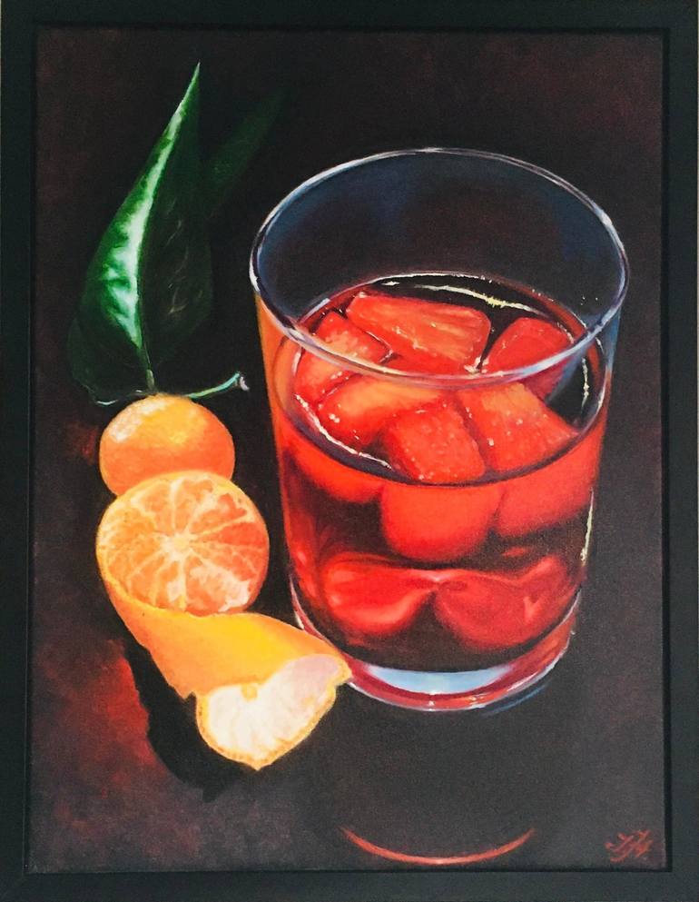 The painting was made by my own original photo. My husband simply loves jello. Once, I made cherry jello with pineapple pieces and these colors fascinated me. I wanted to put the brightness and depth of colors on canvas. The mandarin is completed composition. Very bright and impressive realistic...