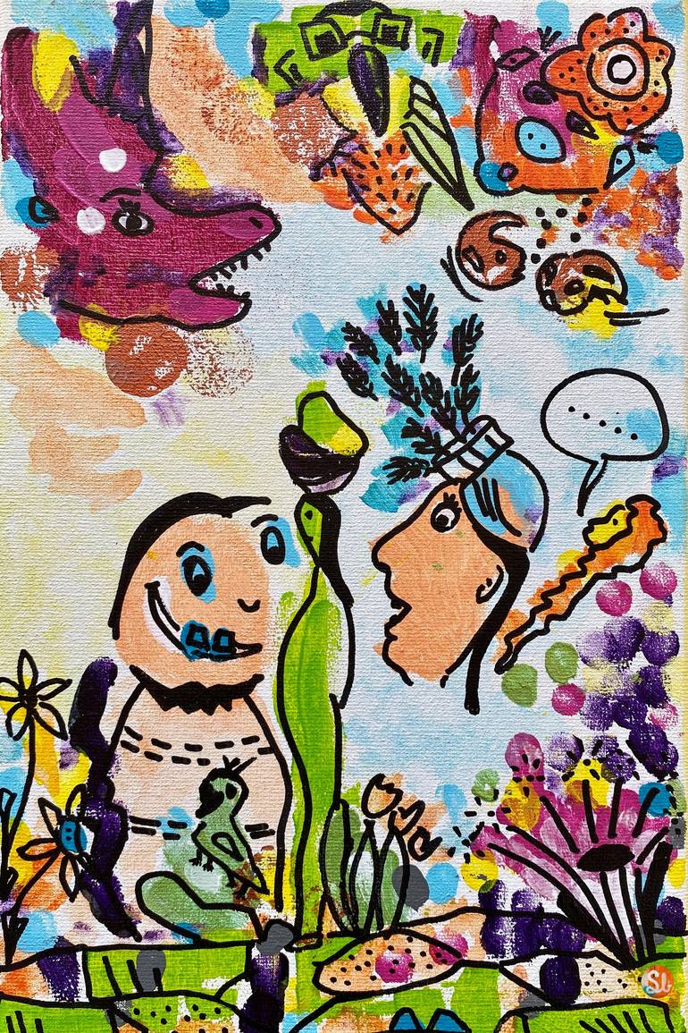 With my art I want to make you smile. My paintings radiate joy and ease. Together with the stories I write for the big formats they stimulate your fantasy and invite you to step into my playful world. (Mit meiner Kunst möchte ich Sie zum Lächeln bringen. Meine Bilder strahlen Freude und Leichtigkeit aus. Zusammen mit den Geschichten, die ich für die großen Formate schreibe, regen sie Ihre Fantasie an und laden Sie ein, in meine spielerische Welt einzutreten.) Hello, I am Suraya Baumeister, born and raised in Heidelberg (Germany) in 1976. I studied landscape architecture in Kassel and Palermo and after living in Karlsruhe for a few years, I moved to Switzerland, to Lake Maggiore in 2010. During my studies (1997-2004) I started to paint abstract, preferably with a spatula. My individual painting style started to form in 2017. The abstract paintings I do are acrylic/mixed media on canvas. I paint them intuitively. Through the abstract painting I get inspired to draw the faces, figures, mythical creatures and elements. What stories do you see in the paintings?