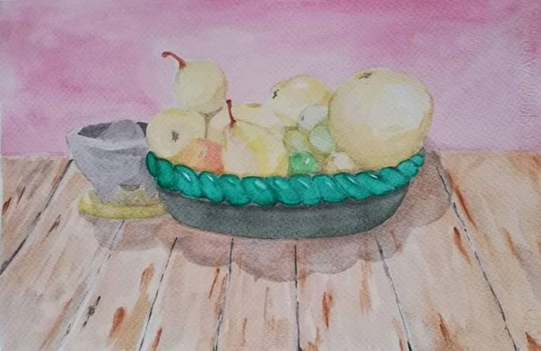 En esta obra pueden verse elementos de la cocina de mi casa, un platón de barro para colocar las frutas, con algunas de ellas encima, y un molcajete de piedra para triturar algunas semillas y condimentos. Una escena sencilla, pero que me hace recordar a mi familia y mi hogar.