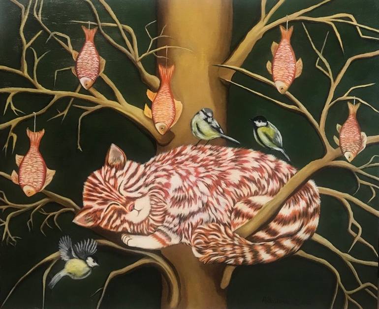 This picture symbolizes the rich life of its owner. A well-fed cat who sleeps calmly, he is not disturbed by either birds or fish, because he is not hungry. I want the viewer, seeing this picture, feel that he is satisfied with himself and his life.
