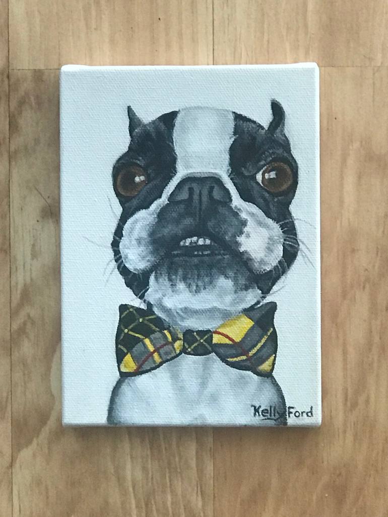 Hi, my latest original painting, a funny little Boston Terrier with crooked teeth wearing his yellow plaid bow tie. It is on a 5 "x 7 " stretched canvas.