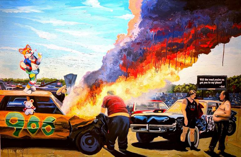 This painting was inspired by my interest in the sub-culture of small town stock car tracks and my most recent interest, "Furries".