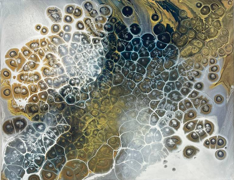 24x30x1.5 Canvas This artwork can be hung either portrait or horizontally. Inspired by the repeating patterns in nature and our connection to the all-encompassing force of life. This work was created with water from the Pacific Ocean US, several layers of fluid acrylic paint, acrylic glazing, an...