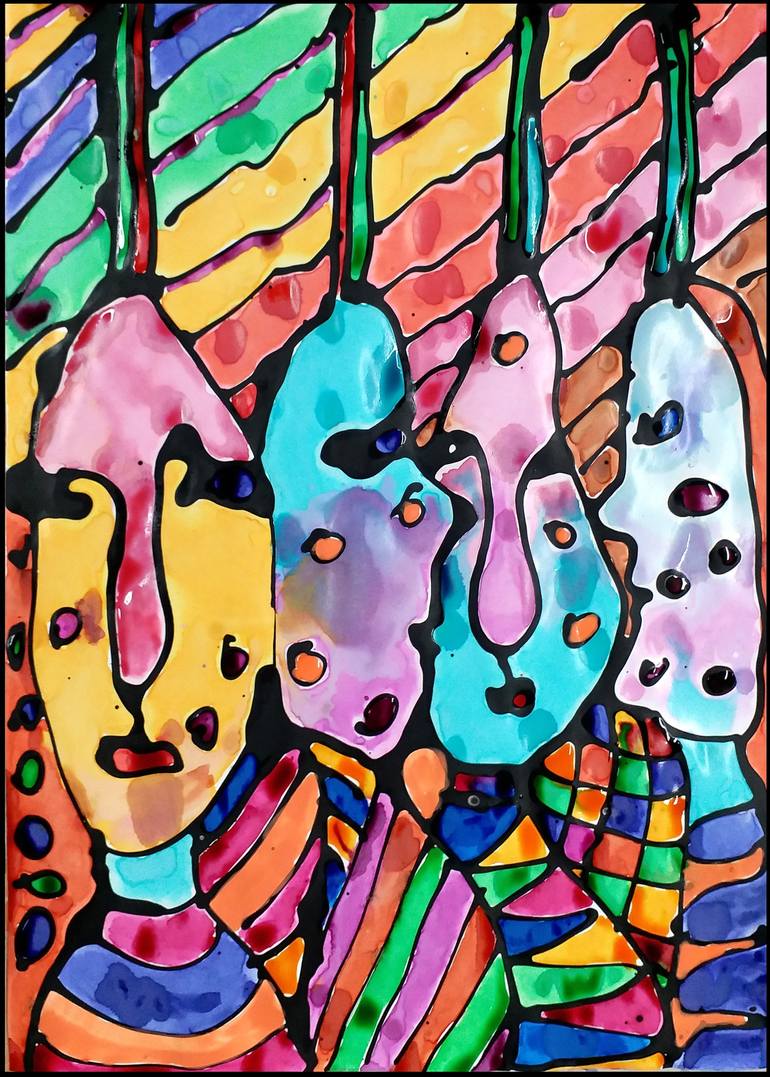 Connected faces with tubes and a variety of colors and backgrounds and stripes, with some inspiration from HUNDERTWASSER.