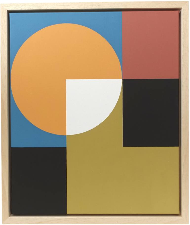 Geometric artwork inspired by the Bauhaus and more than a century of abstract art. Acrylic painting on canvas, with natural wood frame, ready to hang. Dimensions of the canvas: 50 x 60 x 2 cm // approximately 20 x 24 x 1 inches. Dimensions of the frame: 55 x 65 x 4 cm // approximately 22 x 25½ x 1½ ...