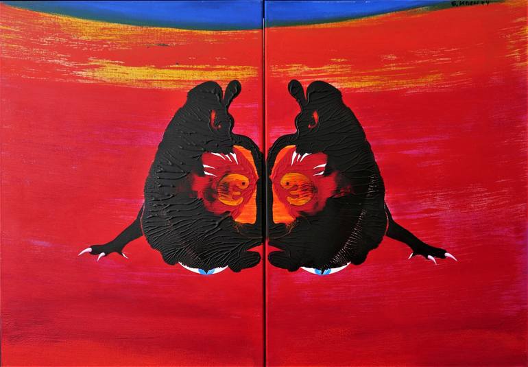 This picture was created in a special technique... As you can see, there are two canvases joined together in a fixed wooden frame. I put a color on one canvas and put it on the second one. In depth psychology, so-called folding pictures are used according to the inventor of the psychiatrist and psyc...