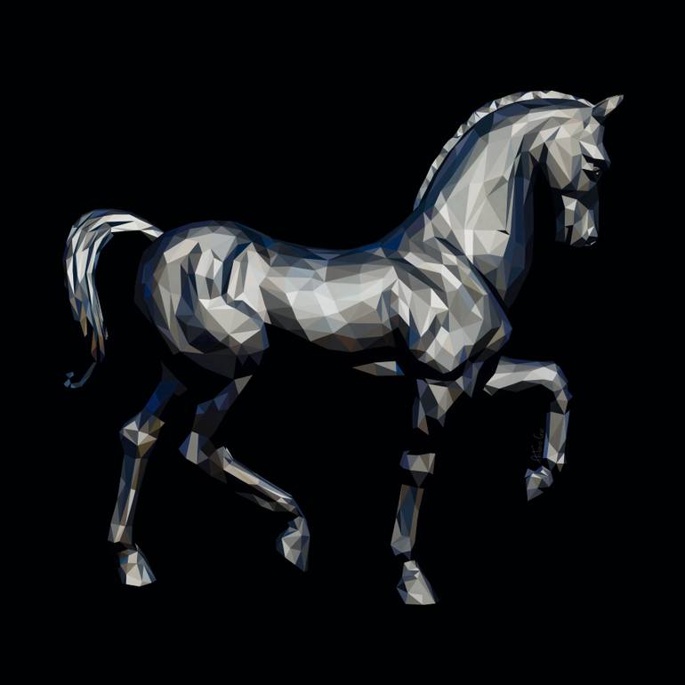 Composed of over two thousand hand-painted polygons in black and white, this oil portrait captures the essence of the Andalusian horse—majestic, poised, eternal. Though fractured into facets, its power remains unbroken, its grace unmistakable. Against a pure black backdrop, each angular brushstroke ...