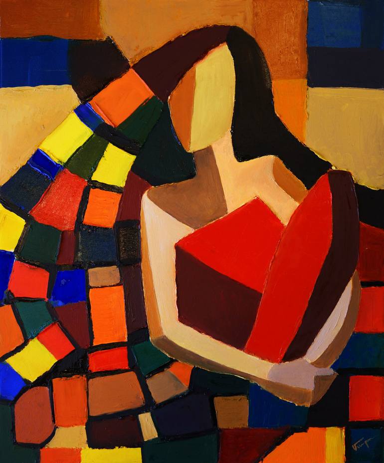 The work is done in a combination of different colors. The figure of the woman is wrapped in a colorful blanket and feels like a song.