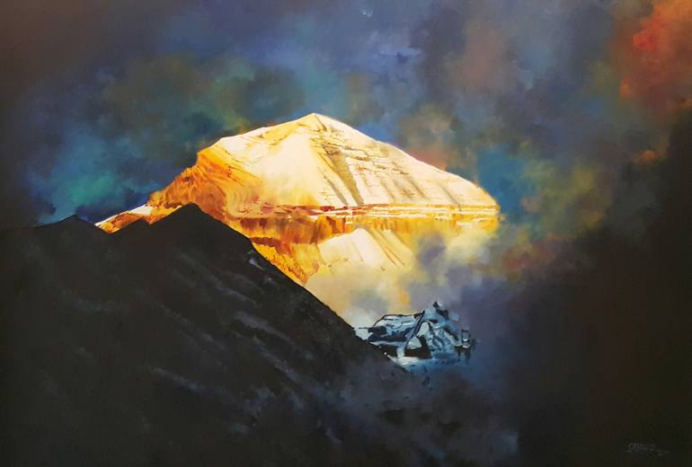 Oil painting by Rajasekharan. Golden Kailas. Realistic painting. Mountain painting.