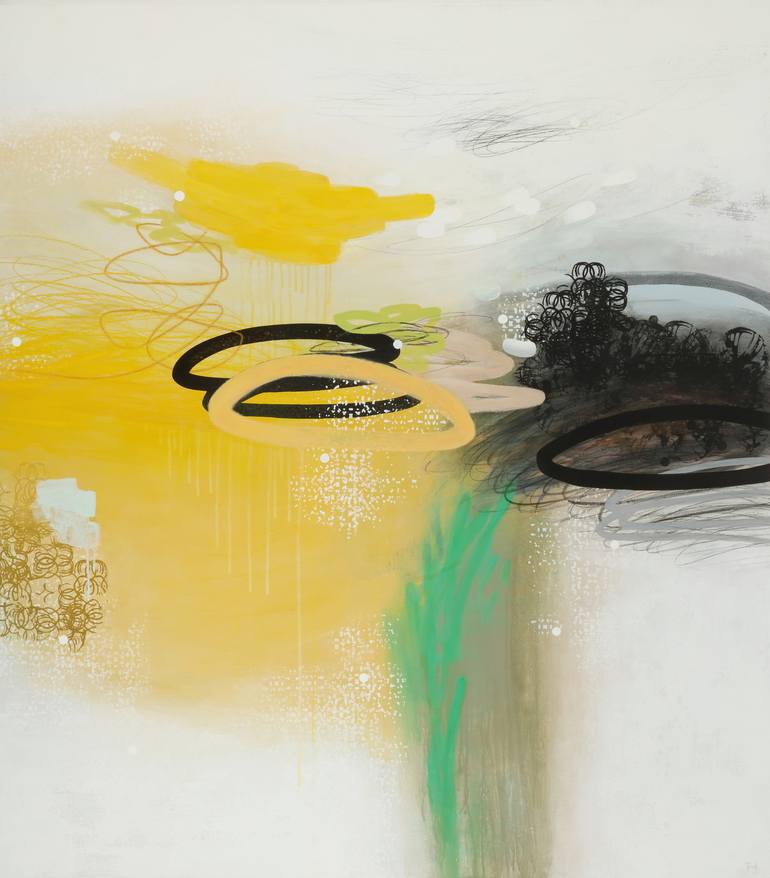 Acrylic and mixed media on wood panel. Abstract imagery and organic lines convey energy, growth and movement. Inspired by nature, expressing a kind of emotional landscape. It also evokes a garden in bloom. The sides of the panel are painted white and it is ready to hang. Signed by the artist on fron...