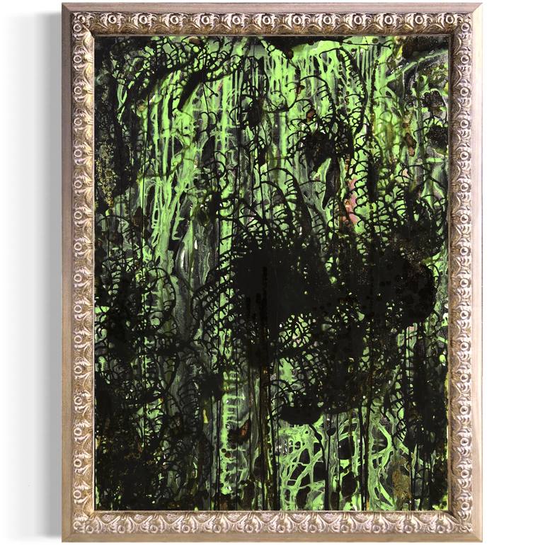This vivid and lush artwork immerses the viewer in the depths of a dense, abstract jungle. The interplay of rich green tones and deep black shadows creates a striking contrast, evoking the untamed energy and mystery of nature. The dripping textures and intricate patterns suggest layers of foliage, v...