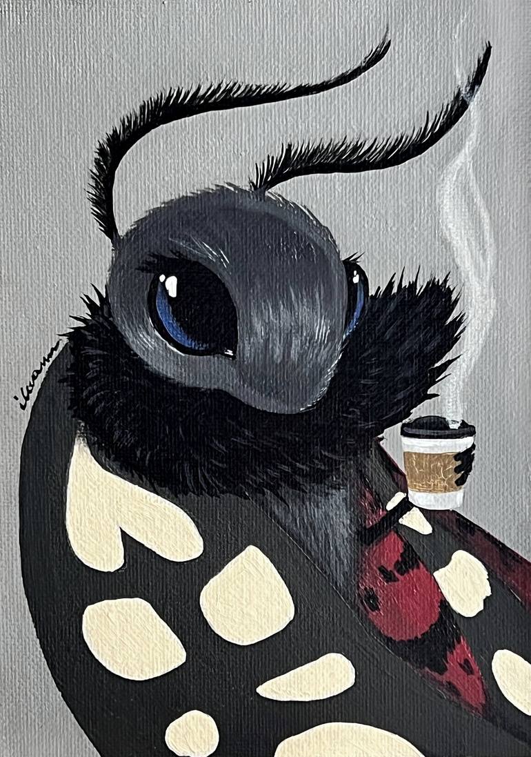 2023 / acrylic and graphite on canvas panel. An illustrative painting of a cute moth drinking a cappuccino on a windy day.