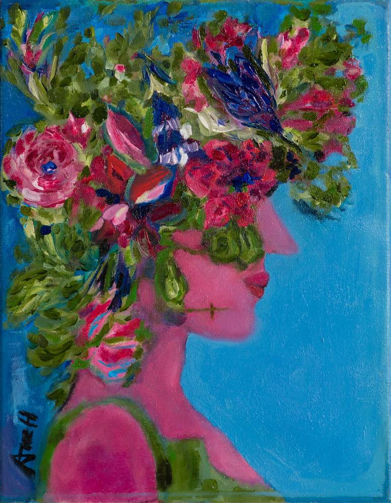 This painting by Ane Howard features a vibrant and colorful portrayal of a woman's profile that blends seamlessly into lush floral elements. The woman's face and upper body are painted in shades of pink, creating a surreal and dreamlike appearance. Her hair is composed of an array of vividly painted...