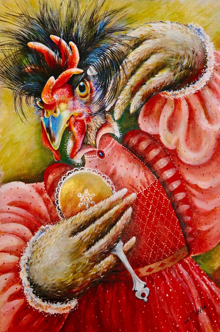 In this artwork it is a hen looking at herself in a mirror, in an human action