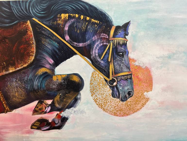 Galloping Glory is a vibrant, abstract acrylic painting that captures the essence of freedom and strength embodied by the majestic horse. Dynamic brushstrokes and layered textures evoke the animal's powerful muscles and fluid movement. A palette of earthy tones, from warm ochres to deep blues, con...