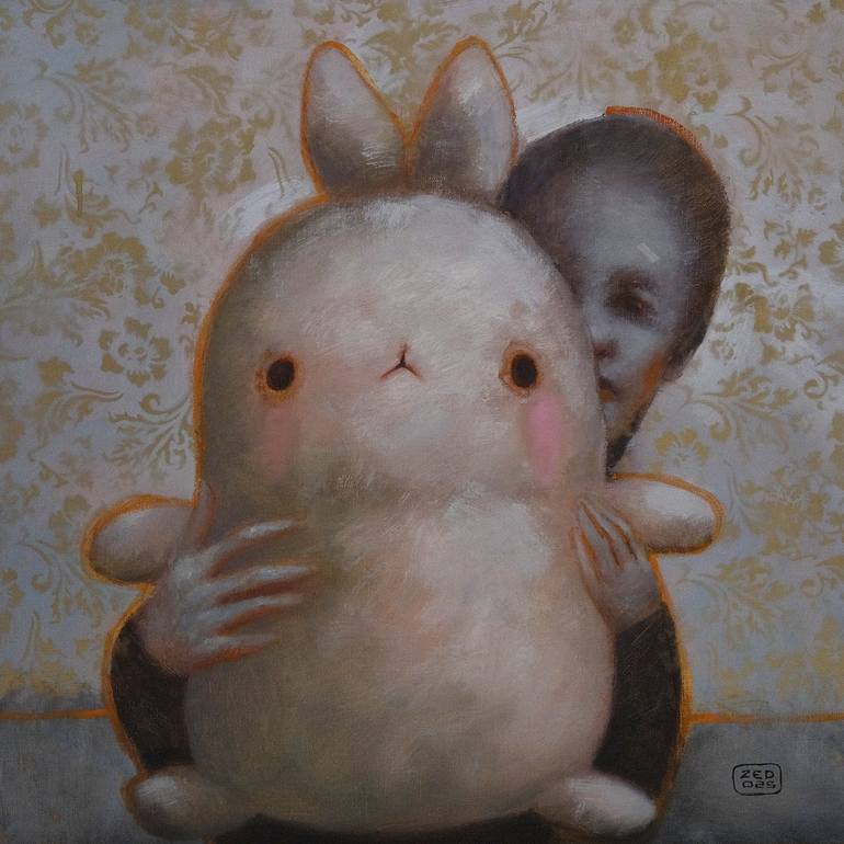 A soft, luminous painting captures a young girl peeking shyly from behind her beloved toy, her eyes full of curiosity and wonder. The gentle light bathes the scene in innocence, inviting the viewer into a world where love and imagination offer quiet protection. It’s a visual meditation on childhood ...