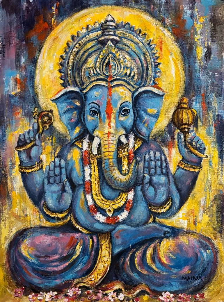 This unique acrylic on canvas art work depicts Ganesha in his classical form however in cool blue tones which is not the usual colours. Ganesha is typically depicted in warm yellow tones. Ganesha also known as the God with the elephant head is one of the most important deities of the Hindu pantheon...