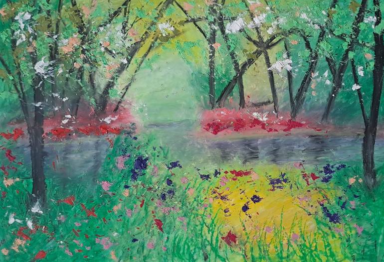 Title: Garden Where Light Rests Medium: Oil pastels and palette knife on paper Dimensions (approx.): Artwork: 36 x 38 cm Framed: 46 x 36 cm Framed: Yes — sold framed as pictured Signed: Front and back Varnished: Yes Orientation: Horizontal Description: Garden Where Light Rests is a verdant, dreamli...