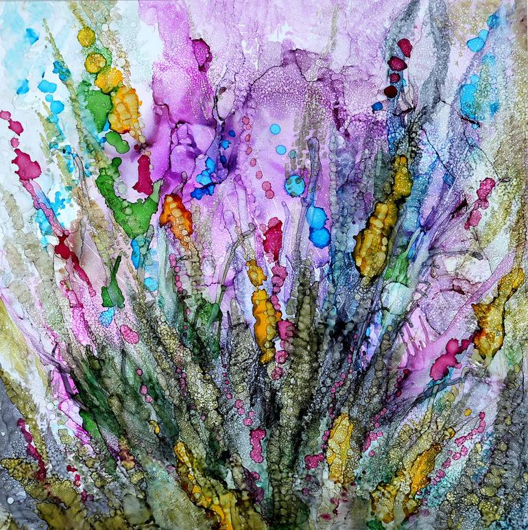 This gentle, multicolored abstract painting radiates with organic energy. Forms spread outward, with delicate specks and blobs evoking blossoms in full bloom. Through the unpredictable bubbling effects of alcohol ink, the artwork achieves a lively, fresh quality that captures the essence of nature i...