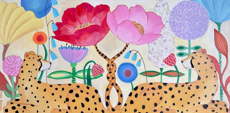 «Garden of Joy» Acrylic on canvas 48” x 24” x 2” in Borders are colored Two cheetahs sit closely in a vibrant garden, their tails gently intertwined as a soft symbol of connection and harmony. Looking into each other’s eyes, they seem at peace, surrounded by blooming flowers and immersed in the j...
