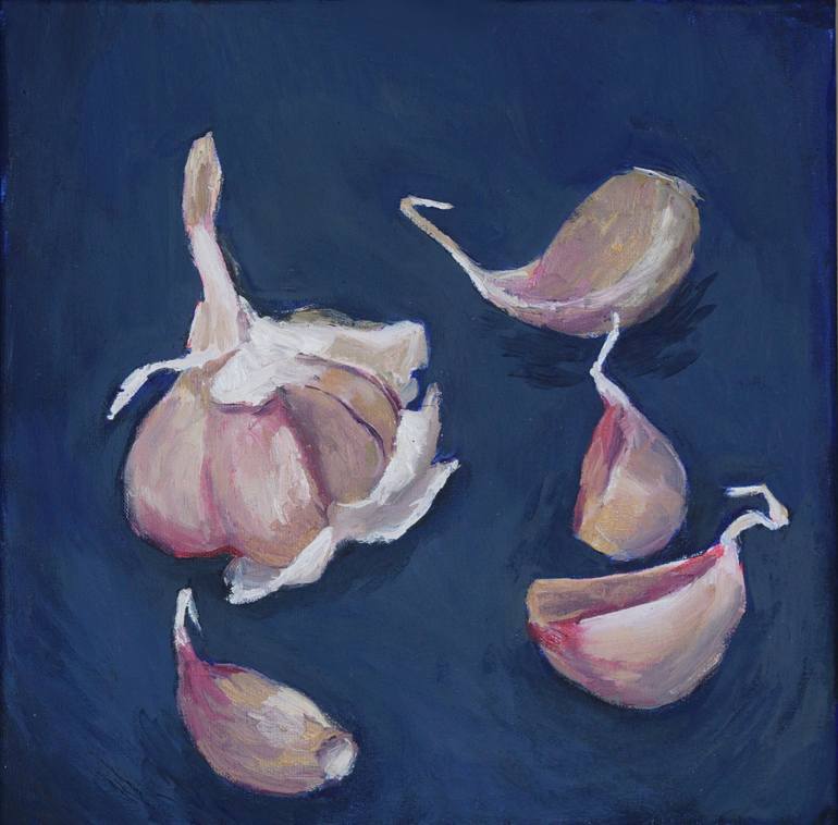 Garlic is one of my favorite plants, in the kitchen and in painting. In the garden, garlic symbolizes growth and transformation. Planted as a single clove, it develops into a multi-cloved bulb, reflecting the potential for exponential growth and the beauty of complexity emerging from simplicity.