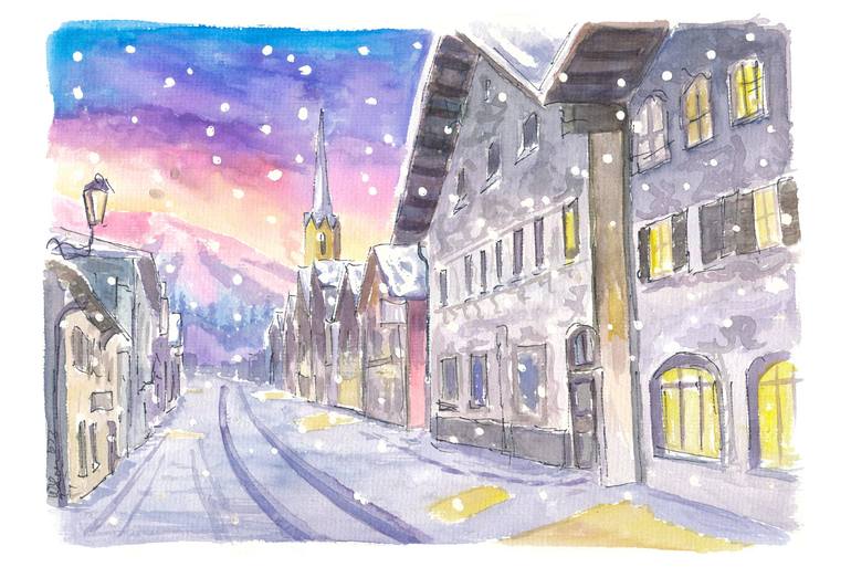 Garmisch Partenkirchen Main Street Winter Scene with Mountain View - watercolor on paper
