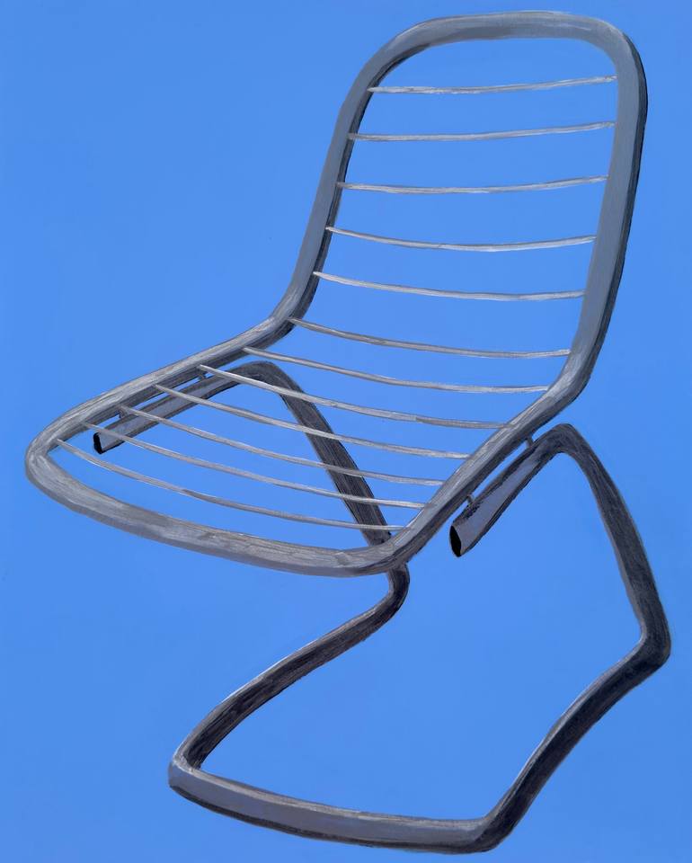 2024, flashe and acrylic on paper, 20 x 16, unframed. This is a still-life painting of a modern silver chair designed by Gastone Rinaldi. I used a special silver acrylic paint that can only be appreciated in person. Signed, dated, and titled on the back.