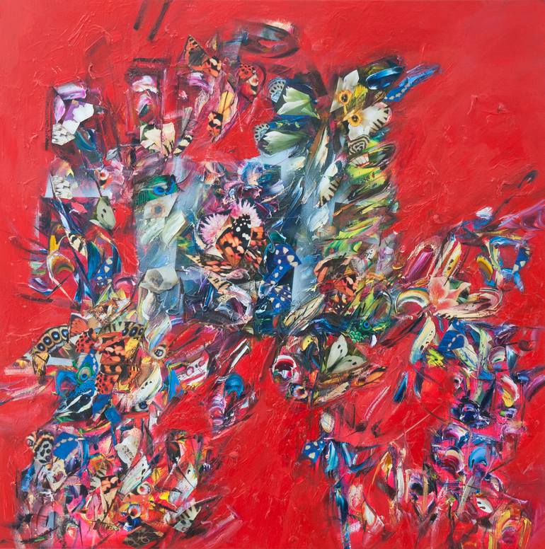 Oils on canvas with mixed media. The artist draws inspiration from nature, enlarging what is typically small giving life and expression to paintings in such a vibrant and joyous way. Butterflies are a key theme throughout her work believing in their symbolic nature and expressing this in different w...
