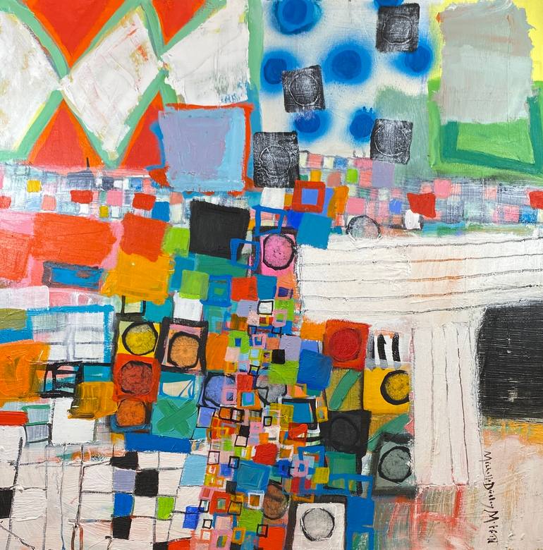 This piece is inspired by my love of quilts and other textiles. The formal elements of color and texture are explored. I hope the viewer will explore the abstract subject and find something personally meaningful to them. The edges of the canvas are painted black. Hardware is attached and it is ready...