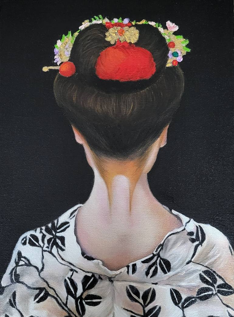 Title: Geisha's Grace Original oil painting of a geisha's graceful neck and kimono Oil paint on high quality gallery wrapped canvas Size: 9"x12" Unframed One of a kind, unique painting.