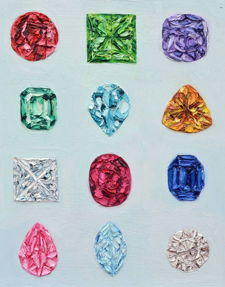 Heavily textured painting exploring the colors, shapes, and textures of a variety of gemstones. Background and edges painted light muted blue; wired and ready for hanging or framing.