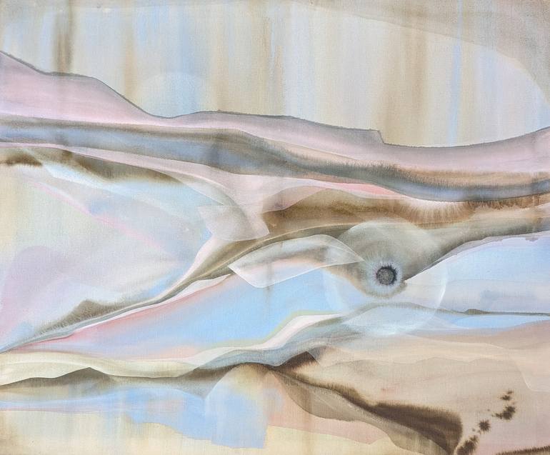 This artwork is a striking example of abstract expressionism, characterized by its fluid forms and harmonious blend of colors. Undulating waves of muted browns, soft pinks, and ethereal blues traverse the canvas, evoking a sense of motion and tranquility. The composition is dominated by sweeping, cu...