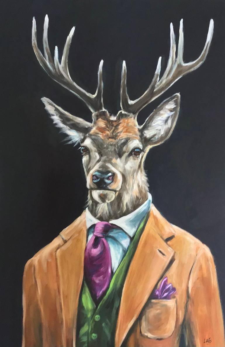 My love of animals and the current fashion for Anthropomorphism inspired this painting. I wanted the stag to be wearing period costume and the colours to be very opulent. I’m hoping the viewer will appreciate how this painting would fit in well in a modern , tasteful, if slightly quirky home. It wo...
