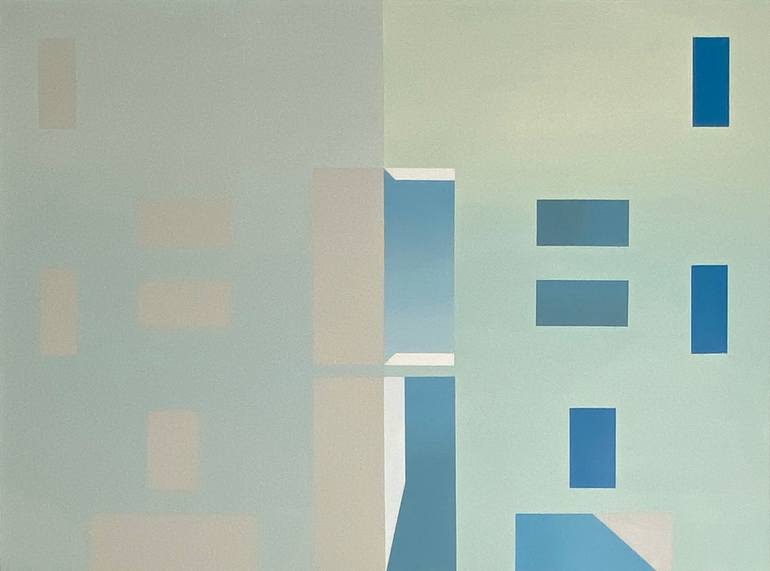 This is an Acrylic on canvas painting sell without a frame. Fu-Le's painting are named by numbers of the painting order. Geometry #64 was inspired by the intersection geometrical shapes between street and buildings.
