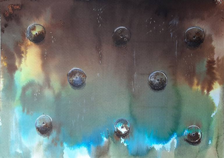 The universe of rust. Time can paint, carve and spill whole worlds on metal surfaces. Oxidation, rain, moisture, various factors can provoke explosions of colors and configurations. Natural painting. The watercolor painting is framed with conservation glass.