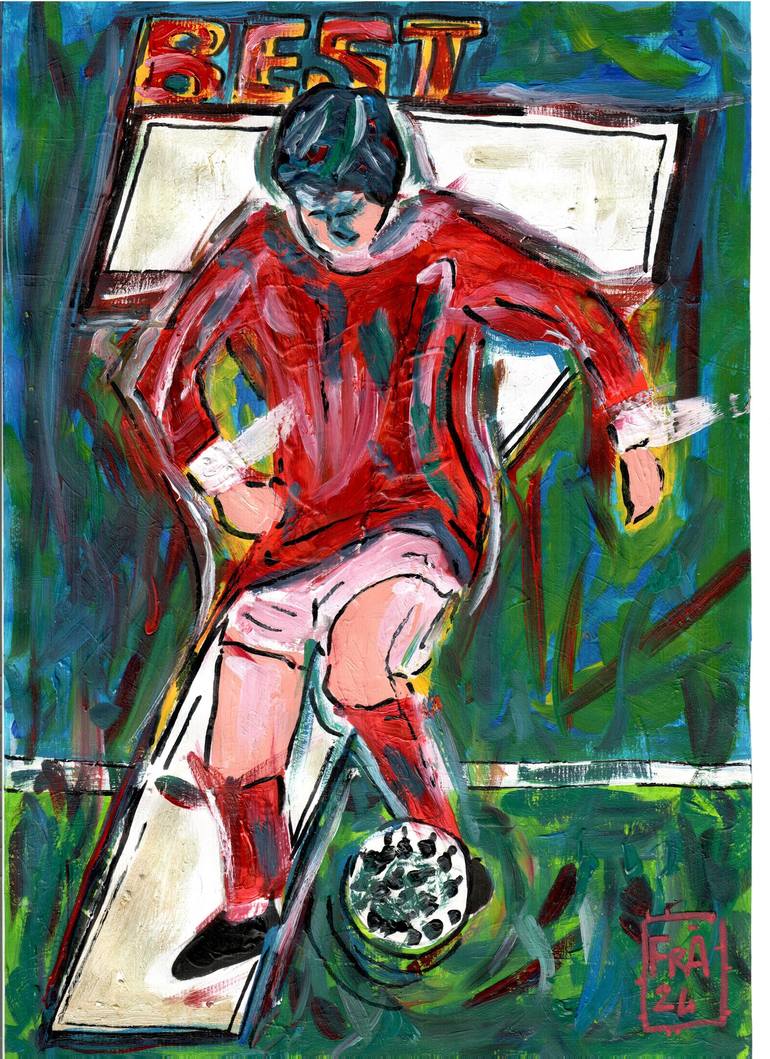 George Best, legendary number 7. I tried to capture his movements, the ones that made him legendary. The large number seven behind him represents his history. Oil on paper with black marker.
