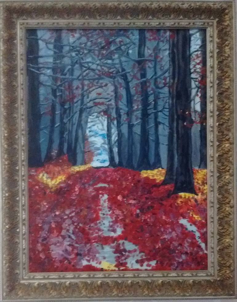 When I went to Germany as a child with my Grandparents I remember so well the incredible German Black Forests wherever we were when we were there. The Grumbacher Oil especially the red and oranges jump off of this canvas like a burning fire. I wanted to paint some trees and branches and get rid of...
