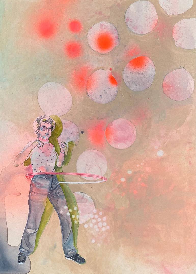 Most humans have the ability to mentally escape for a moment, or more, with a simple act of recreation. Plucked from a vintage, found photograph this mom-like lady righteously hula hoops her way into fun. While her skill level is unclear, her sense of seriousness and confidence invites the viewer ...