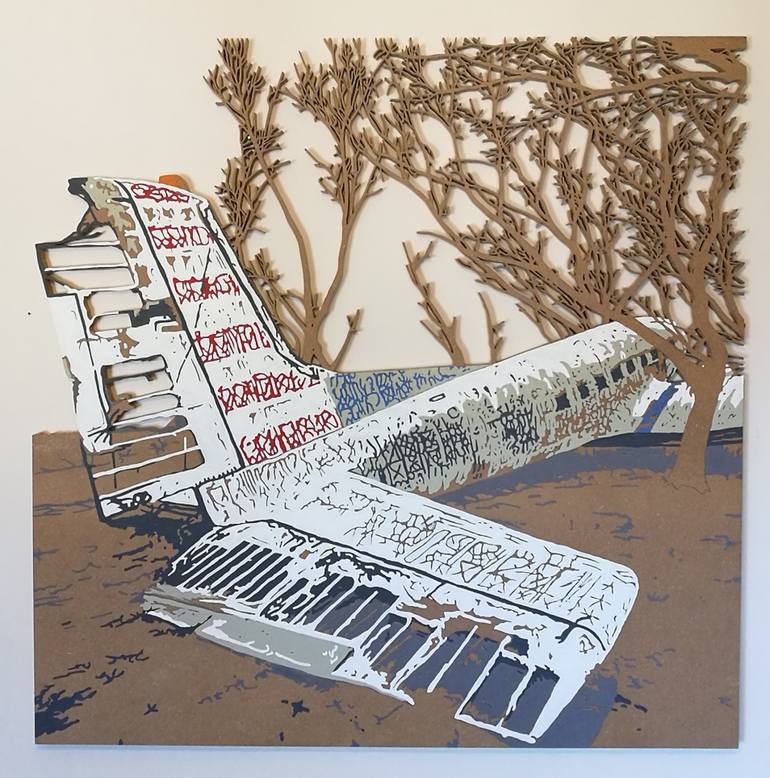 Spencer is interested in how our world is represented to us through simulated images in the media and how these in turn form our comprehension of the world around us, basing his pieces on images from the media and internet. His works are cynical of utopian notions surrounding our relationship with the natural world, effectively combining medium, process and aesthetics as message. The MDF, household paint and painstakingly slow hand cutting process that he uses gives the work a raw abandoned aesthetic, creating scenes which depict gritty disenchanted visions of man-made structures and waste in woods and forests.