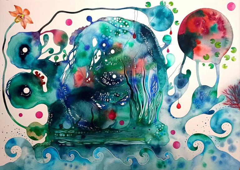 Ilaria Finetti was born in Siena, she attended the Art Insitute and graduates in painting. She immediately showed a predisposition and a strong love for the watercolor technique. Her passion for illustration took her to attend the International School of Illustration of Sarmede where she had the chance to improve herself with Arcadio Lobato. Her artistic background led her to look for a merger between an illustration poetic language and a more abstract and surreal language, made of organic shapes, dreaming figures that float between the transparencies of the watercolor evoking fantastic and visionary worlds. Her art is inspired by nature, microcosm and biology. A recurring theme in her works is fertility, the process of life creation and the intrinsic connection with water, the center of this cog. His works are present in private collections in Italy, United Kingdom, United States. "I let my idea be guided. Water, shape and color are decisive accomplices and they take me where they want.." "Acqua" Water The water is the central element of my work. Indeed, the technique where it is the absolute protagonist and the magic of forms generated by the interaction of water and colors is shown, was not randomly chosen. Thanks to it, I have a continuous inspiration and I manage to transport the liquidity of my thoughts into art. Water is seen as an element in which we should plunge and trace the source of life. Big and small drops, tears ready to show all the beauty of their fluid nature.. "Altre forme" I love putting on paper the internal dynamism of life, getting into his intimity with the desire of looking under the surface of things. The view of organic forms, cells, microbial growth and biology, have always fascinated me. Microorganisms observed under the lens of the microscope are works of art in miniature and give inspiration to my work. My hand is not guided by scientific knowledge, but by an intuitive force that describes those secret forms to our eyes, revealing a generous future of fantastic and fertil worlds. "Cordoni" The umbilical cord, which dispenses the nourishment, represents the union of mother and son. It is also the symbol of emotional attachment and psychological link between the two. All of this goes beyond the nine months of pregnancy. This archetype can be extended to endless ties, that form cords and threads full of emotional and mental energy.