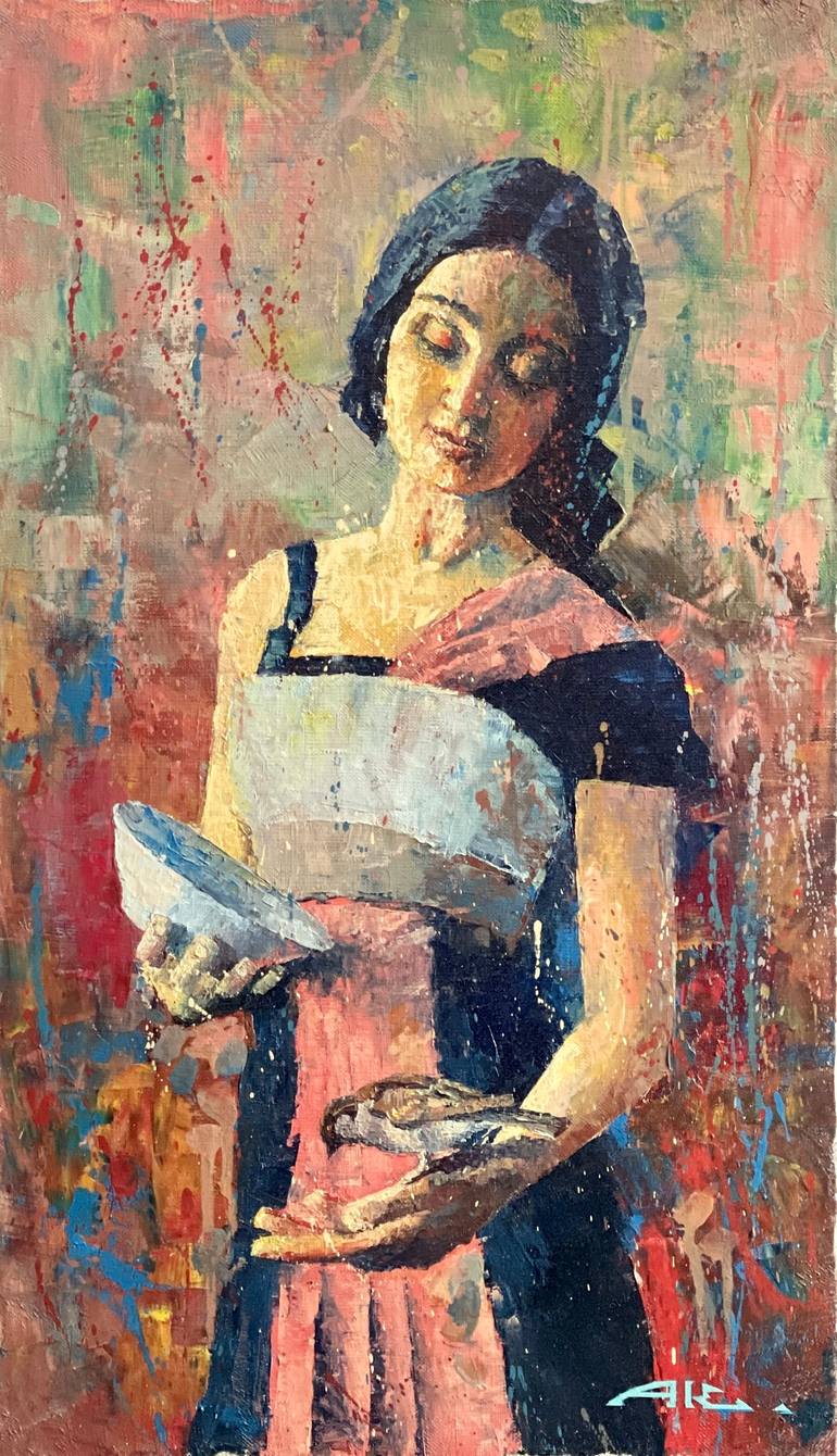The painting has a gentle, peaceful atmosphere, evoking a sense of calm and serenity. Overall, the painting ( Girl feeding sparrow ) captures a simple, natural moment of connection between a person and a small, fragile creature, highlighting the beauty and fragility of the natural world.