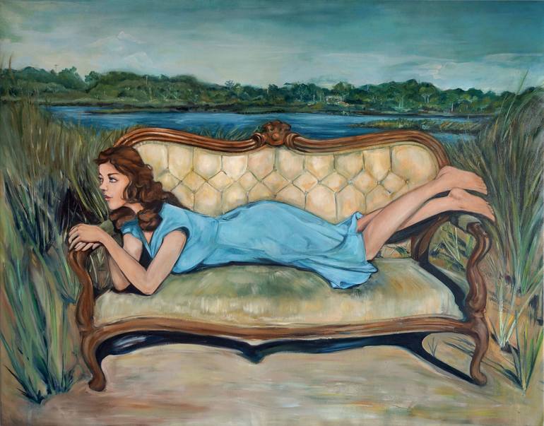 This painting is currently on exhibition at Women Writing For A Change Foundation, Jacksonville Florida "Girl in Blue Dress" 60 x 72 x 1.5 in oil on canvas This work was inspired by a longing for the nostalgic quality of nature and the coast. In part this painting was inspired by the word "sauda...